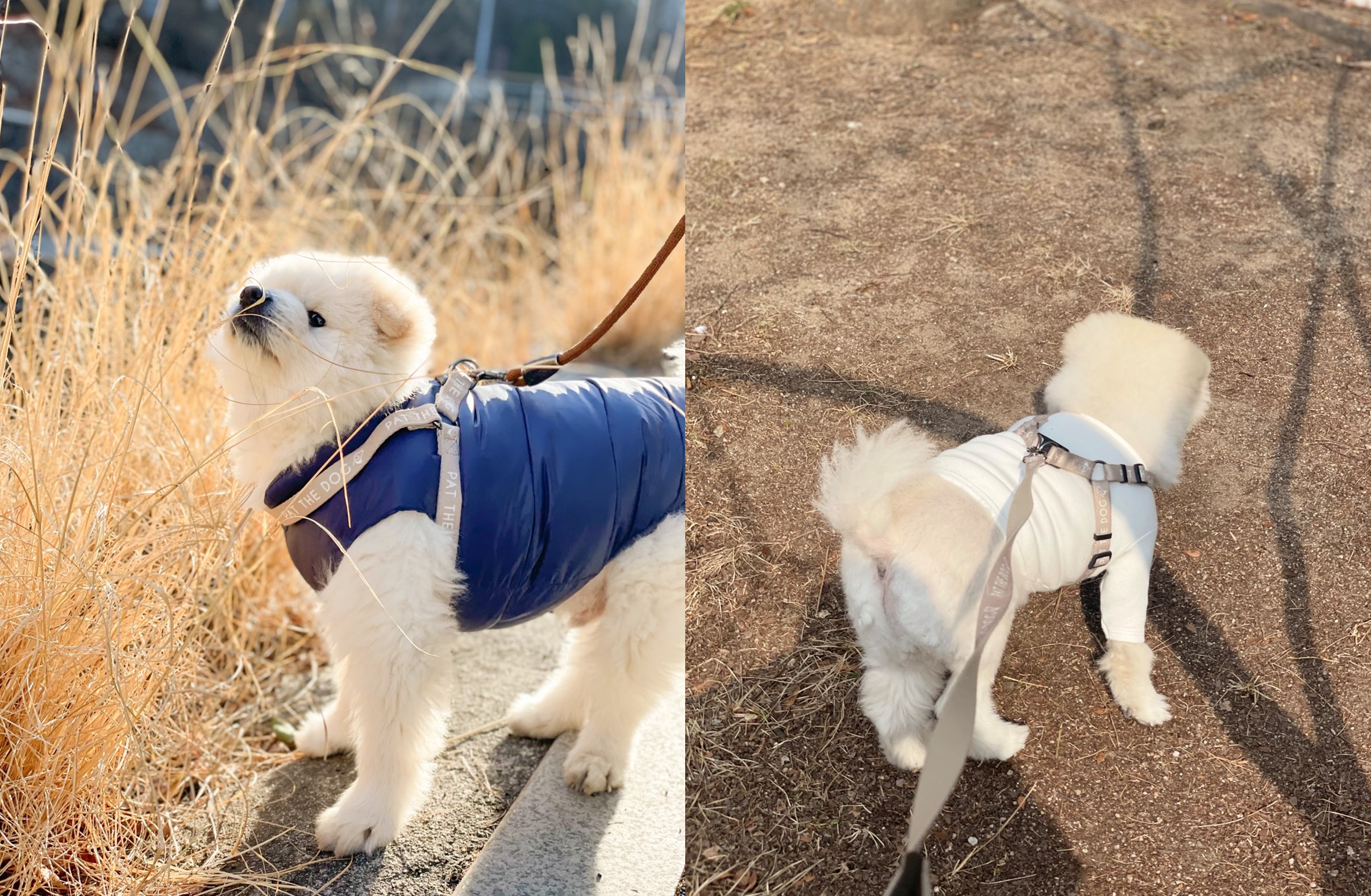 장시간 산책 시에는 중간중간 산책용품을 확인하고 조절해야 합니다. 특히 여름철에는 하네스 아래쪽이 습해져 피부 트러블을 일으킬 수 있으므로, 산책 후에는 건조시켜 주고 피부 상태를 확인해야 합니다.